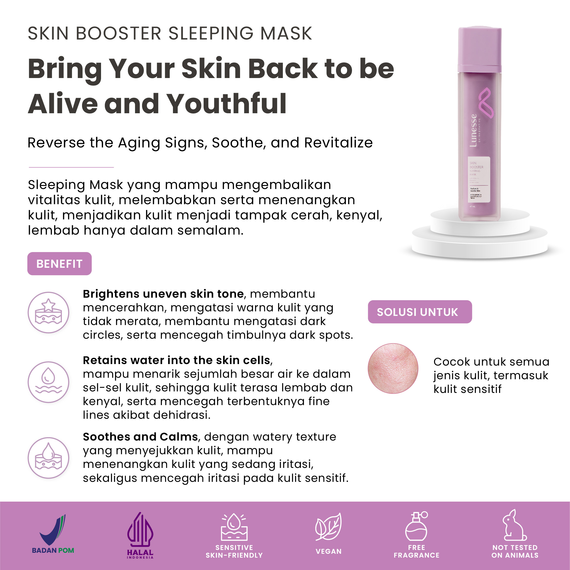 Ke-3 bahan aktif tersebut ada di produk Lunesse Skin Booster Sleeping Mask, masker wajah overnight (tanpa bilas) yang bertekstur gel, mudan meresap dan tidak lengket. Membantu meratakan warna kulit, mencerahkan, melembabkan, dan menenangkan kulit.
