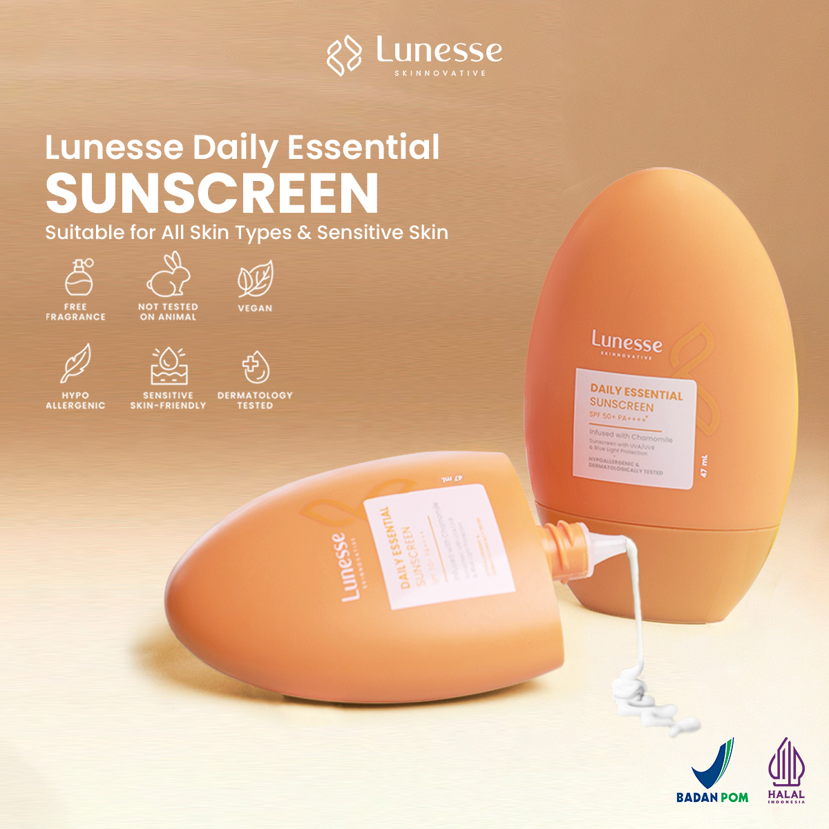 Lunesse punya SPF 50+ dan PA++++, artinya kamu dapet proteksi maksimal dari sinar UVA yang bisa bikin penuaan dini, dan UVB yang bisa bikin kulit terbakar. Proteksi tinggi ini bantu menjaga kulit tetap sehat, cerah, dan bebas kerusakan akibat sinar matahari yang jahat.