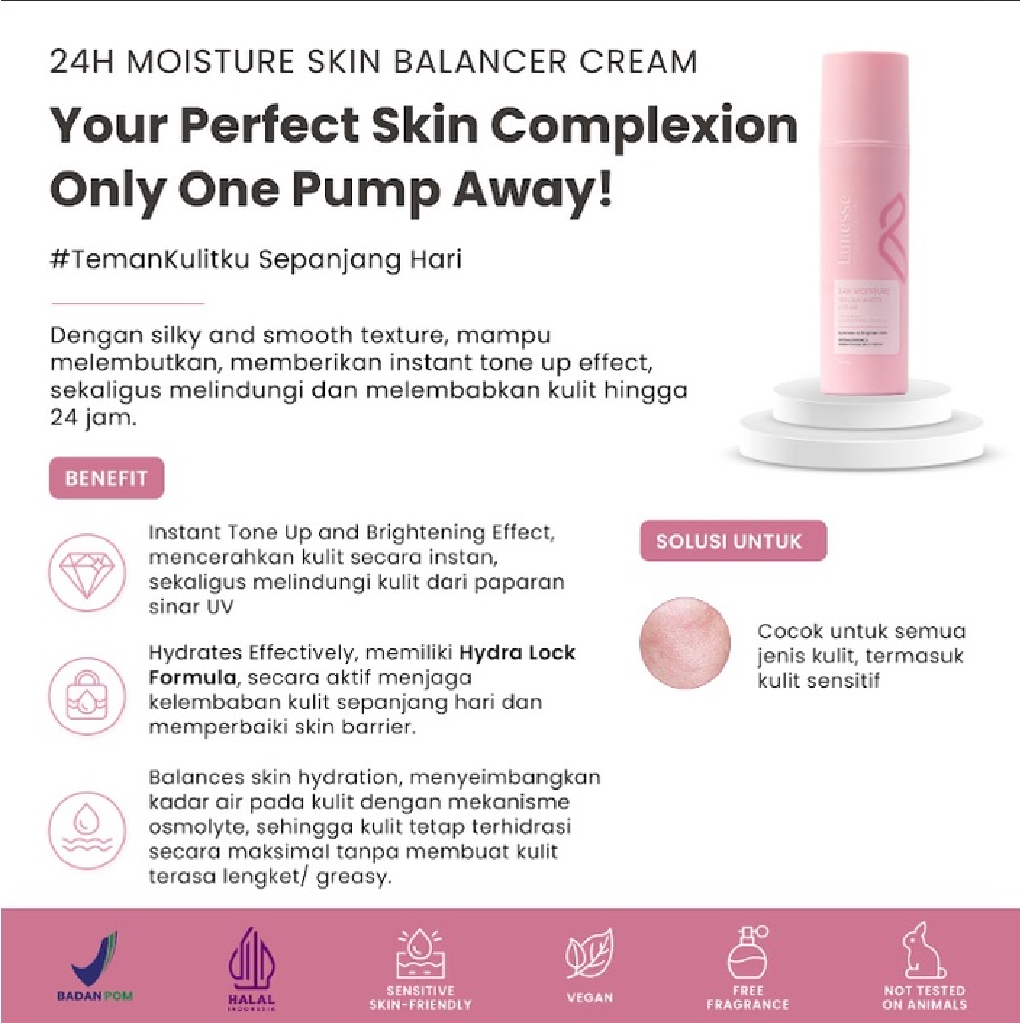 • Instant Tone Up and Brightening Effect: Ini bukan sekedar pelembap biasa; Lunesse 24H Skin Balancer Cream juga menyediakan efek instan mencerahkan kulit dan memberi tone up effect yang membuat kulit tampak lebih cerah dan hidup, sekaligus memberikan perlindungan dari efek buruk sinar UV.