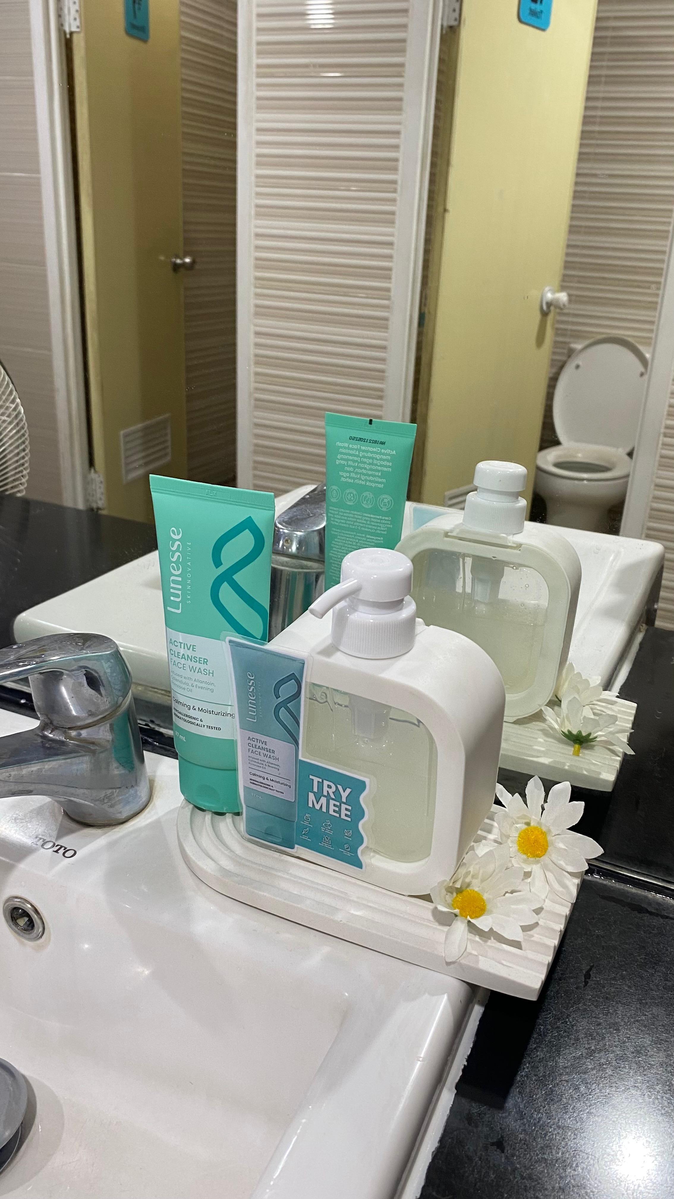 > Kamu bisa mencoba Lunesse Active Cleanser Face Wash di area toilet Fithub, dengan X-banner Lunesse yang mudah ditemukan.