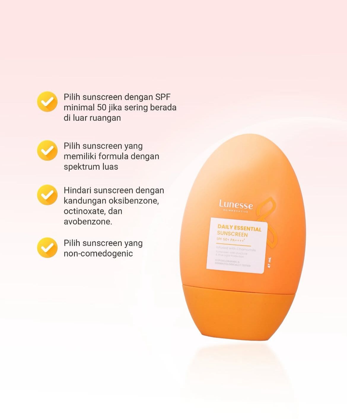 Untuk perlindungan maksimal, Nessetizen bisa memilih Lunesse Daily Essential Sunscreen SPF 50+ PA++++, yang memberikan perlindungan UVA & UVB tinggi, tekstur ringan, nyaman digunakan harian, dan cocok untuk semua jenis kulit. Penggunaan yang konsisten dapat membantu mencegah kulit belang dan meminimalkan risiko hiperpigmentasi.