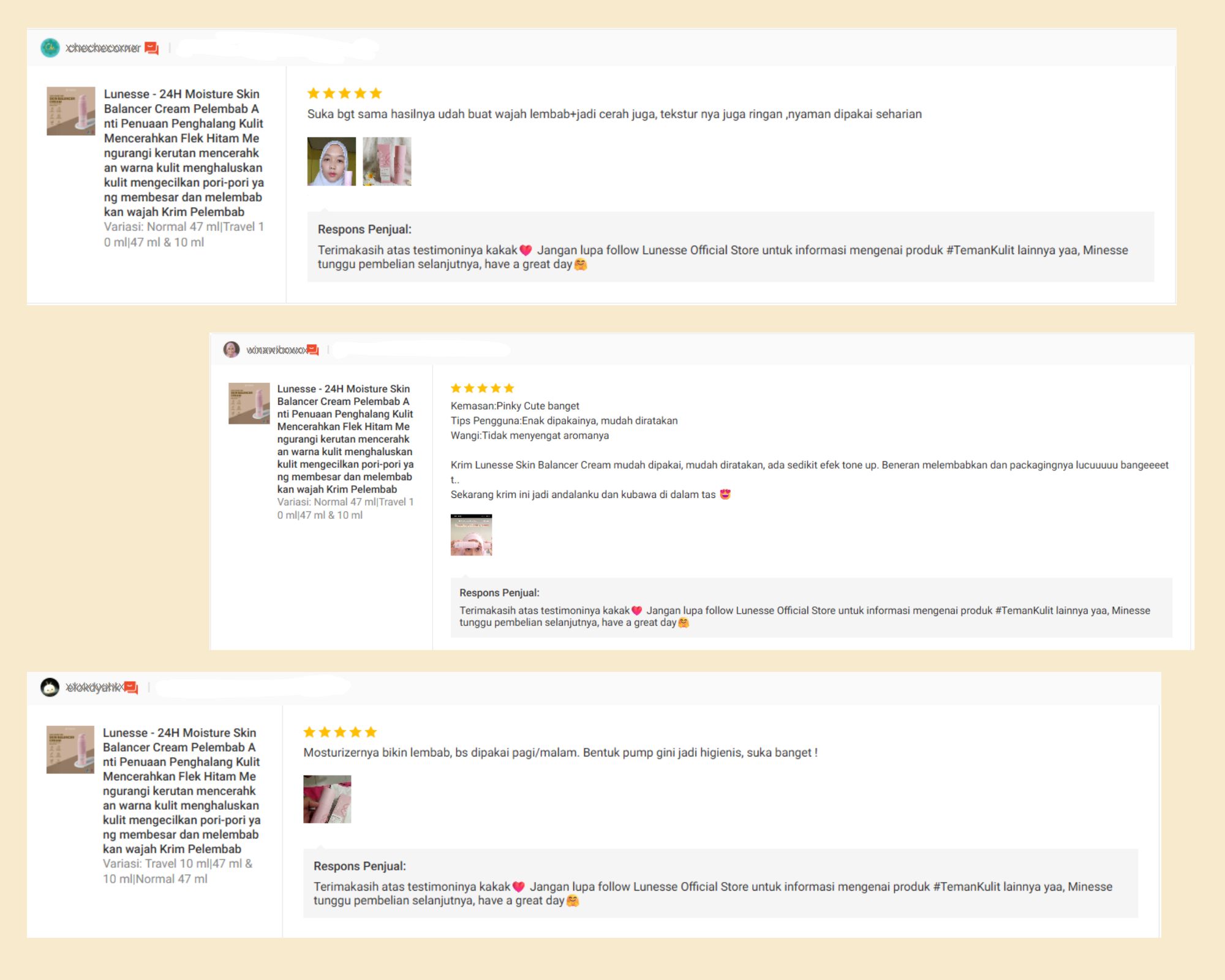Lunesse 24H Moisture Skin Balancer Cream semakin menjadi favorit banyak pengguna berkat teksturnya yang ringan, lembut, dan kemampuannya menjaga kulit tetap lembap serta tampak cerah sepanjang hari. Berikut rangkuman pengalaman asli para pelanggan setelah mencoba produk ini.