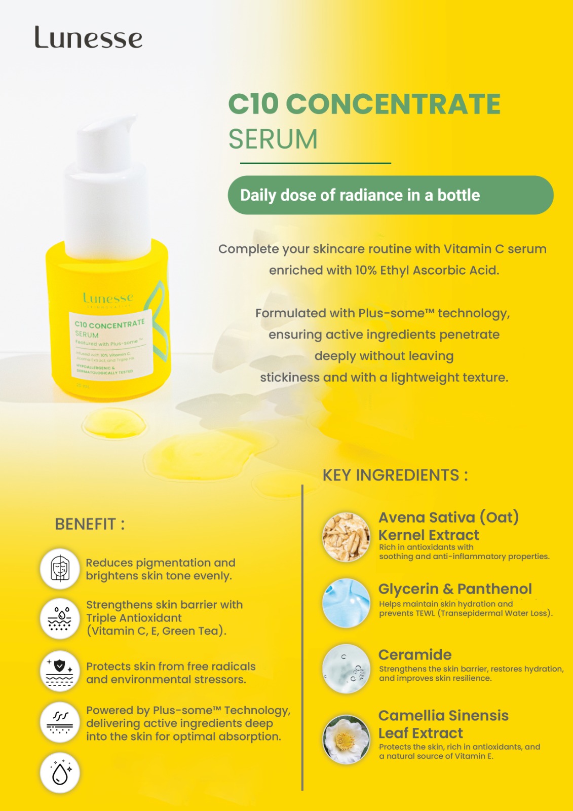 Menariknya, kandungan ini juga sudah ada di Lunesse C-10 Concentrate Serum, sehingga kamu nggak hanya mendapatkan efek brightening, tapi juga perlindungan kulit dalam satu produk.