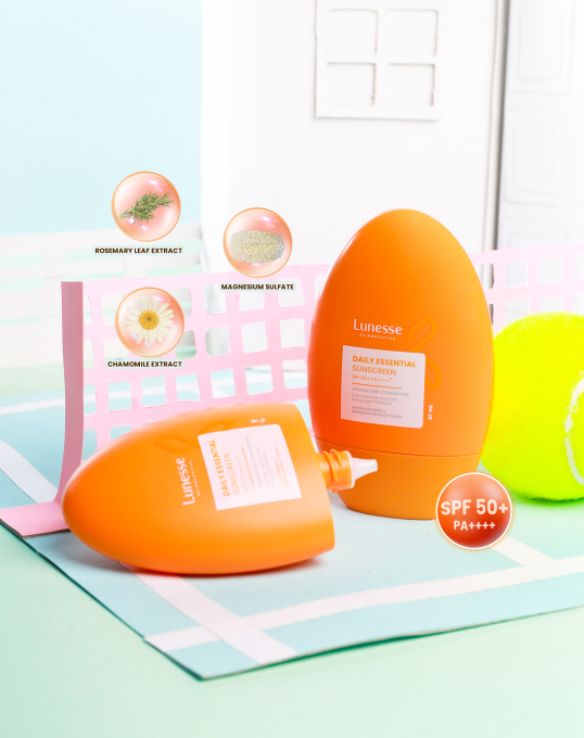Daily Essential Sunscreen dengan formula non comedogenic yang cocok digunakan bahkan untuk kulit sensitif dengan sistem blok 3 arah (melindungi kulit dari UVA, UVB, dan blue light) serta tekstur yang mudah menyerap, lightweight, dan tidak lengket di kulit serta bebas dari bahan-bahan beracun dan berbahaya.